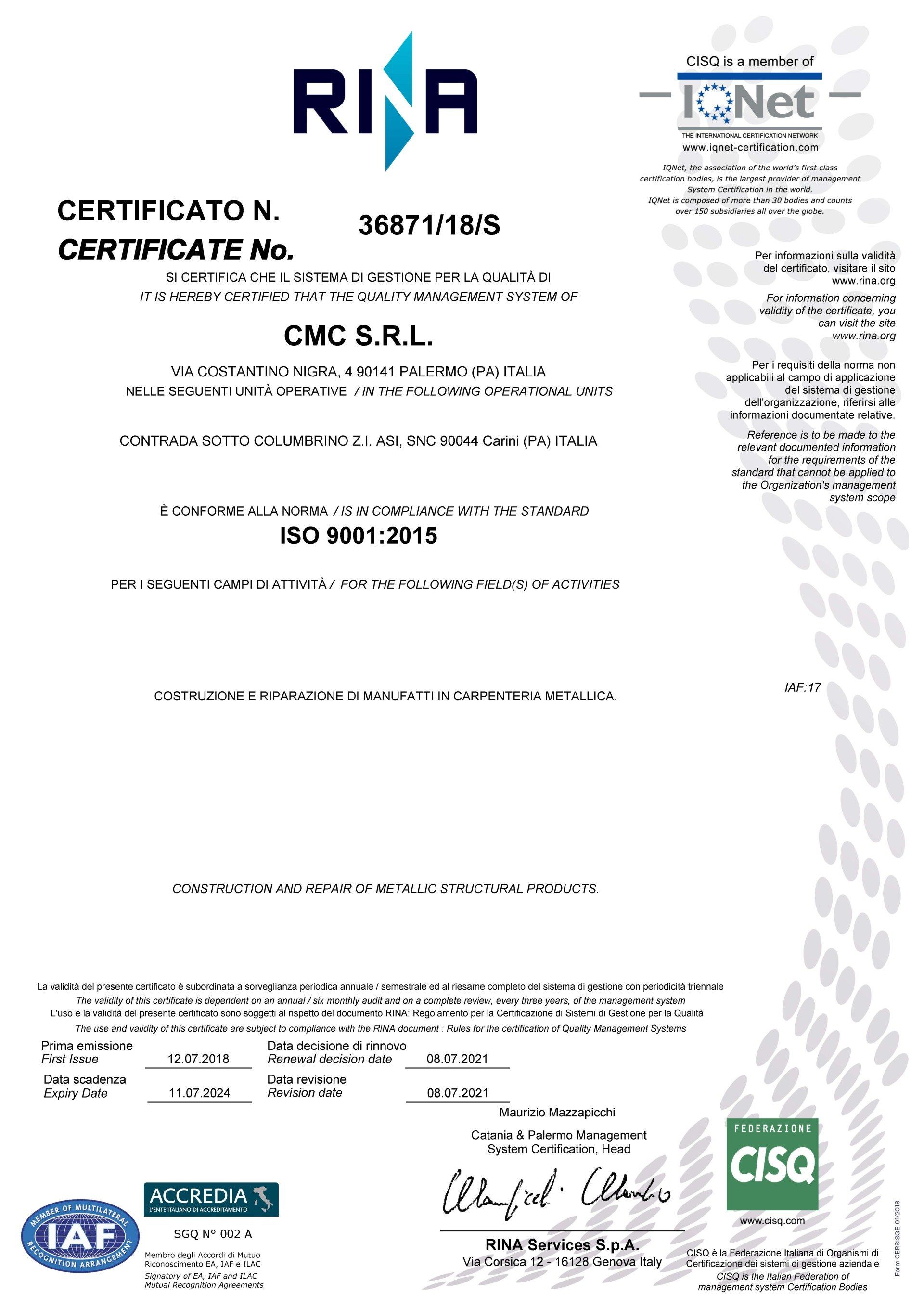 - ISO 9001:2015;